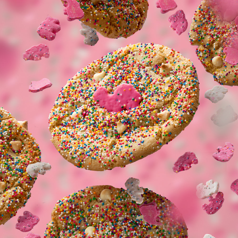 - Frosted Animal Cracker – Our traditional brown sugar base stuffed full of rich and creamy white chocolate chips and pressed in rainbow sprinkles with a frosted animal cracker cookie on top!