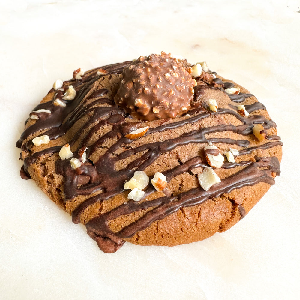 Well you better sit down because this cookie is all Nutella. We fold tons of Nutella into the base of this soft and chewy cookie and mix in some semisweet chocolate chips. Then we stuff the cookie with a Nutella filling and drizzle it with chocolate. Then it gets topped with chopped hazelnut and a Ferrero Rocher chocolate truffle.