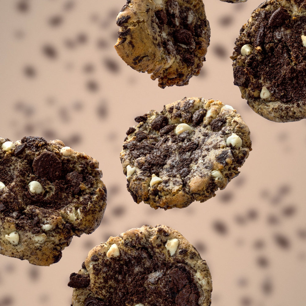 We add massive amounts of whole Oreos to our classic brown sugar batter and fold in just the right amount of creamy white chocolate chips. The Oreos are slowly added whole to the batter with the mixer running to break the Oreos into big delicious chunks.